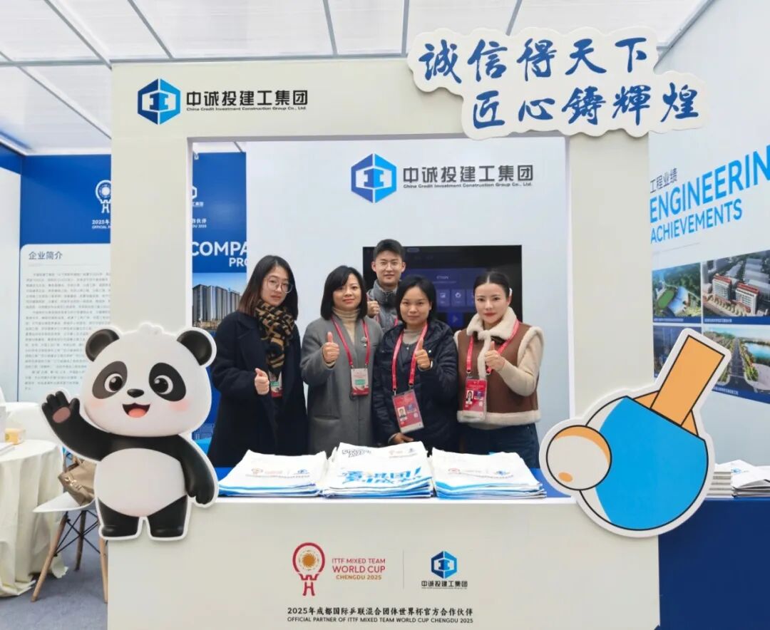 作为官方合作伙伴,中诚投建工集团以“建工+体育”跨界设计亮相世界杯公园,展位采用商务蓝与乒乓白为主色调,融入建筑轮廓线条、工程业绩及乒乓元素。展位现场设有趣味打卡区,游客可与熊猫、乒乓球元素同框,为喜爱的球员拍照、拍视频打Call,参与打卡并关注官微,即可免费领取定制款“看混团到成都”帆布手提袋。